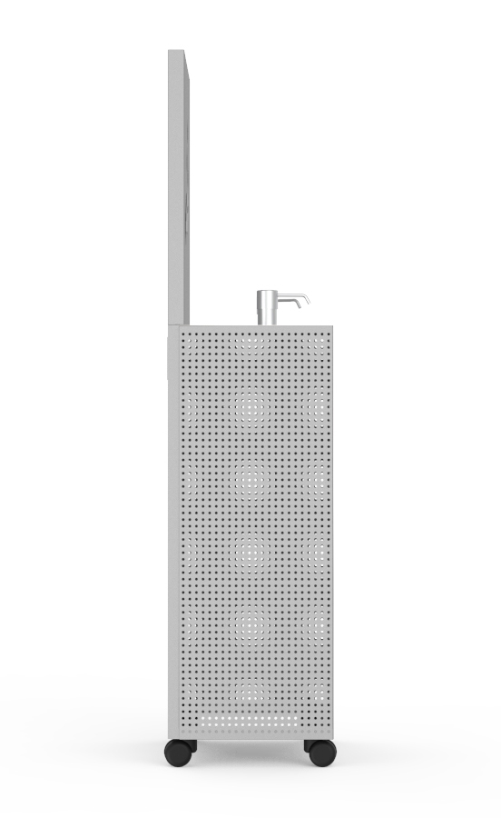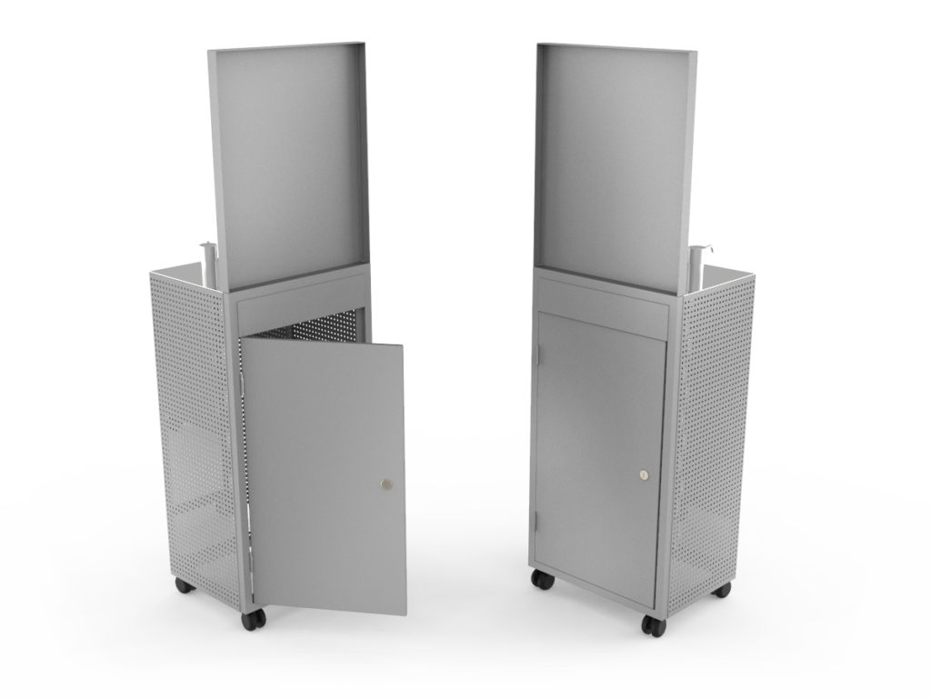 No requiere instalación, es fácilmente transportable y posee una puerta en la parte trasera para un fácil recarga de alcohol en gel.