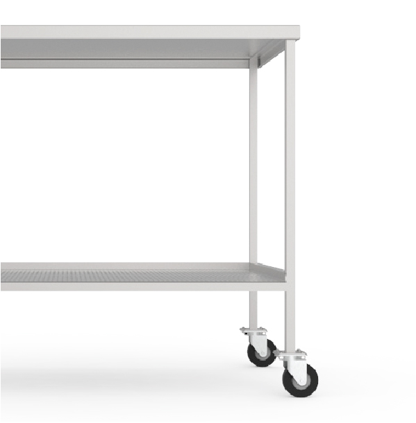 Mesa utilitaria móvil esterilizable, para transportar insumos y adaptar a distintos ambientes. Fabricada en acero inoxidable.