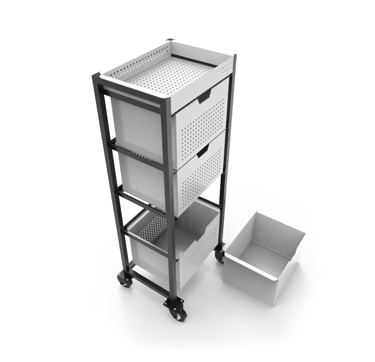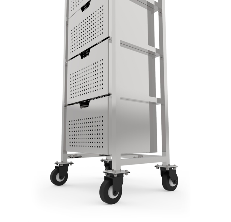 Carro móvil con canastos metálicos desmontables para un fácil transporte de instrumental.