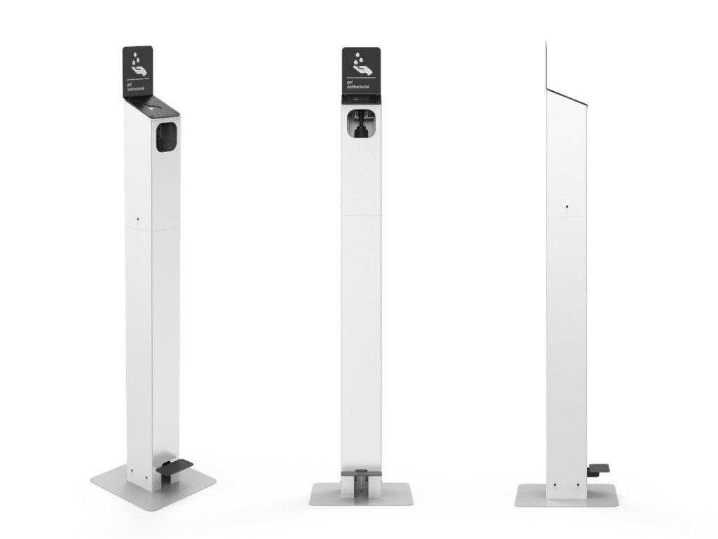 Desarrollamos una estación sanitizante que se activa con el pie: un dispenser de alcohol en gel que se activa presionando un pedal en la parte inferior del producto. Esto permite un mayor nivel de higiene al evitar el contacto directo, y por ende menos posibilidades de contagio.